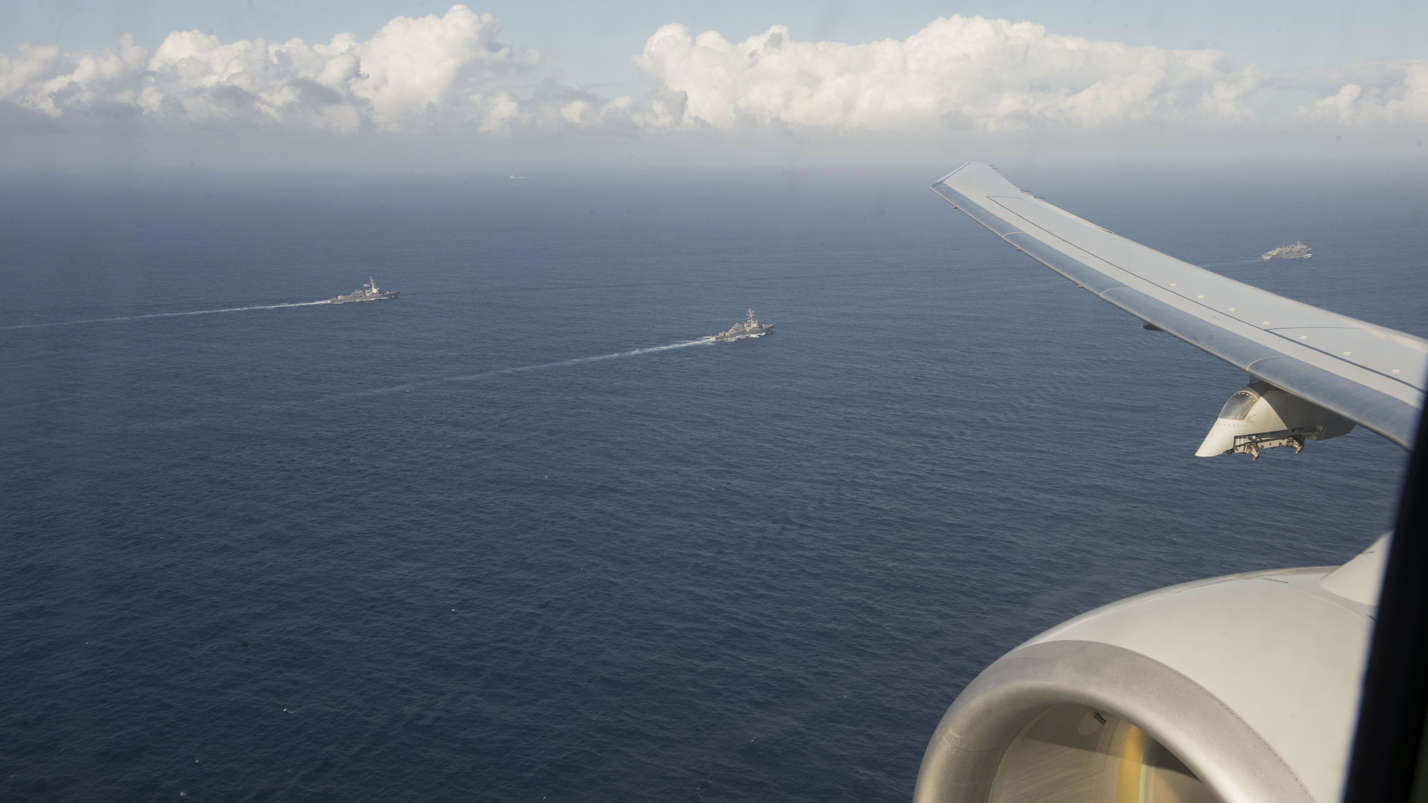 Three Navy destroyers operate with a pair of P-8As