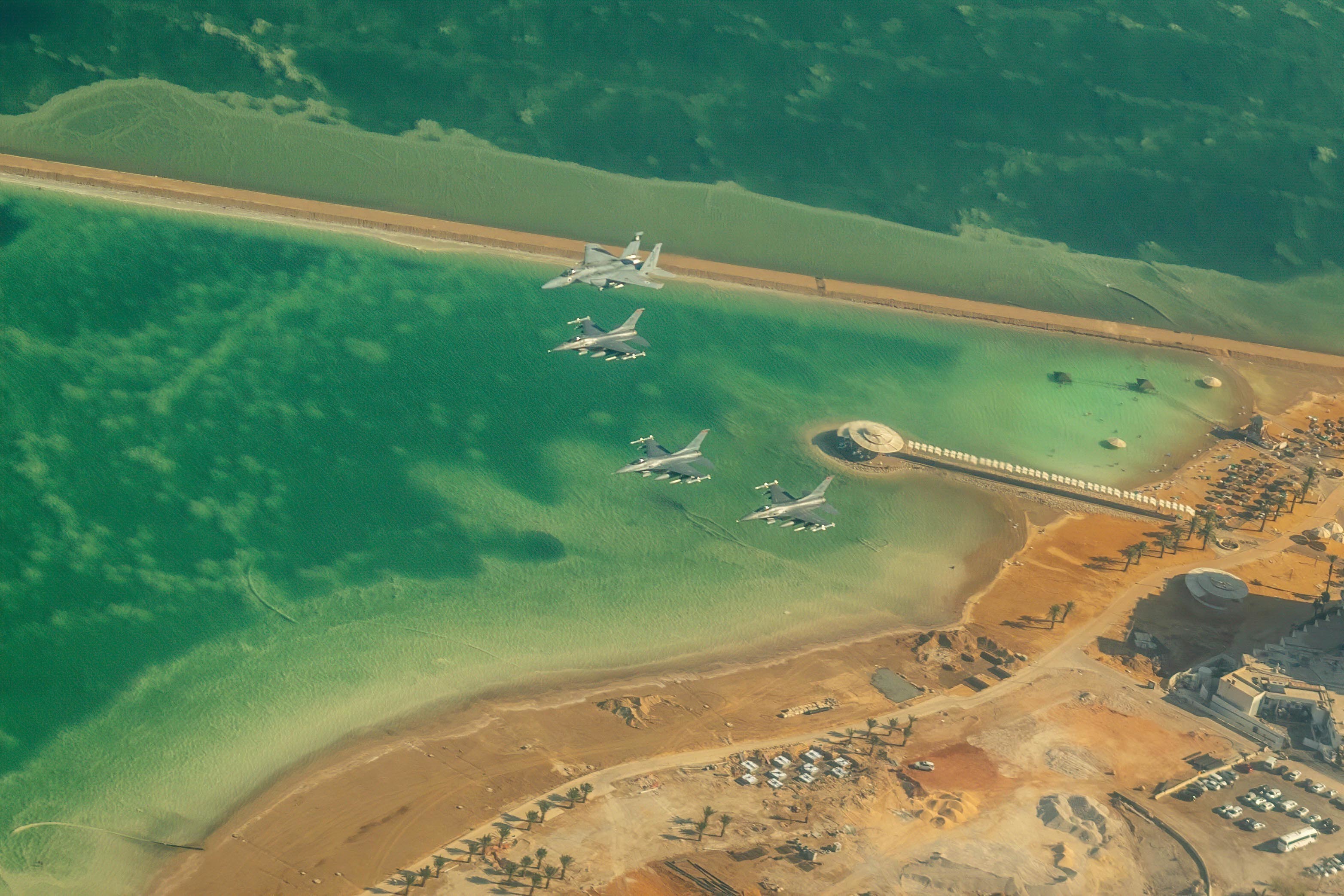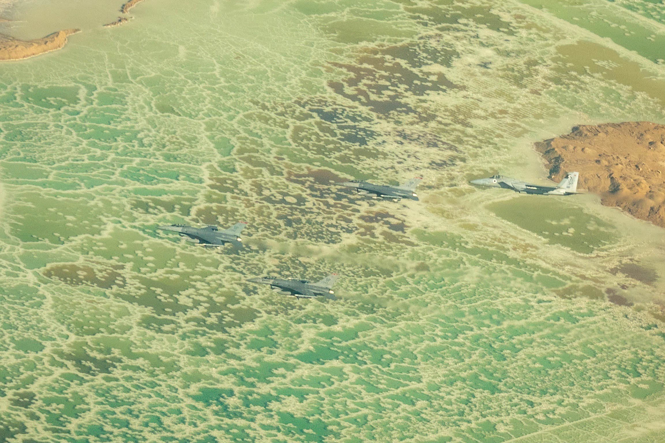 Three U.S. Air Force F-16 Fighting Falcons, assigned the to 480th Expeditionary Fighter Squadron, fly with an Israeli air force F-15I Ra'am over the Dead Sea, during exercise Blue Flag 2019 at Uvda Air Base, Israel, November 5, 2019. Blue Flag 2019 provided Airmen with the opportunity to practice low-altitude flying. (Courtesy photo by Israeli air force public affairs)