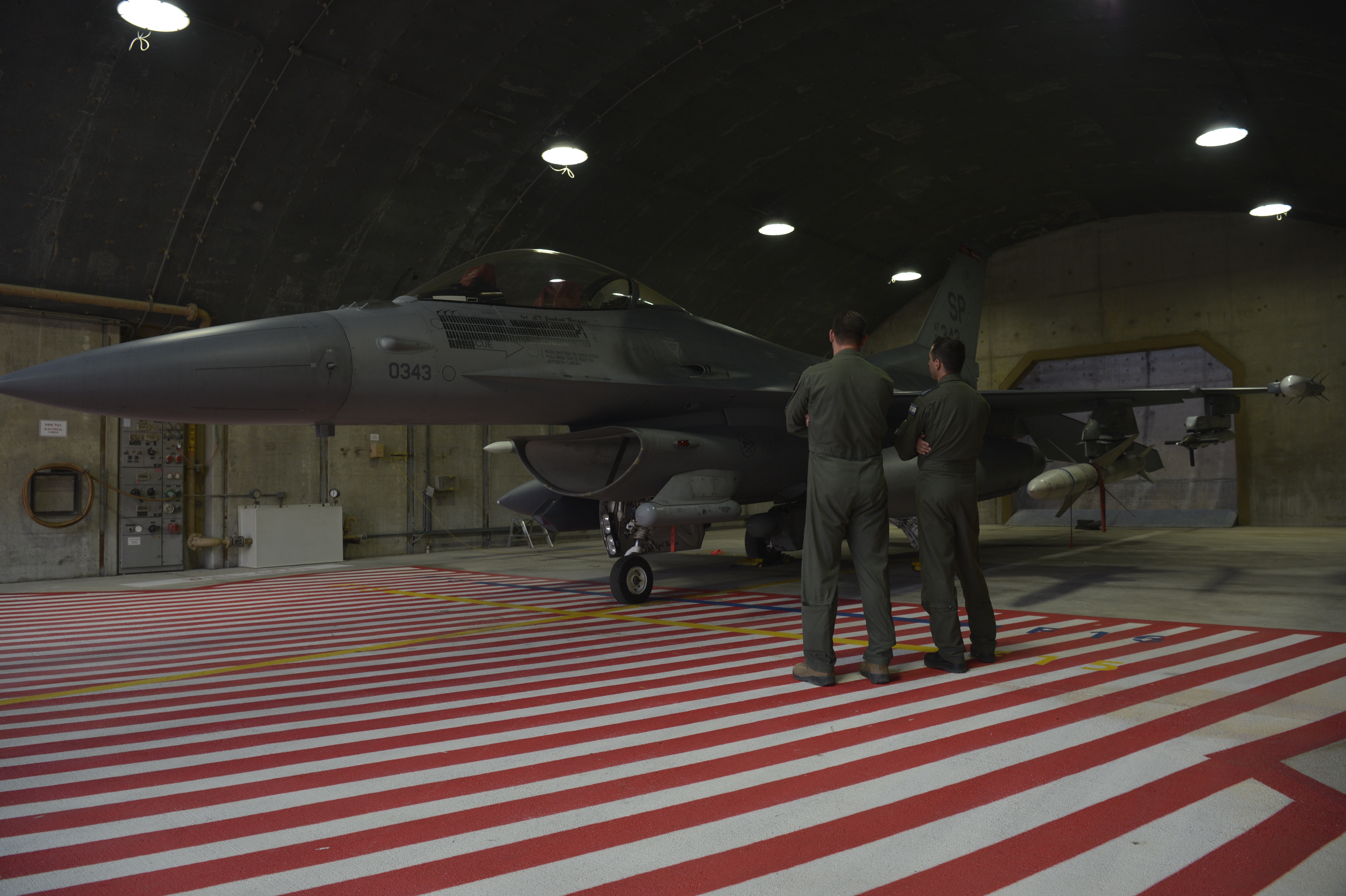 U.S. Air Force Capt. Robert Kouwe, 480th Expeditionary Fighter Squadron F-16 Fighting Falcon pilot, left, speaks with Israeli air force Capt. D., 133rd Fighter Squadron F-15I Ra'am pilot, during Blue Flag 2019 at Uvda Air Base, Israel, November 6, 2019. The two were discussing the F-16 and F-15 airframes. (U.S. Air Force photo by Airman 1st Class Kyle Cope)