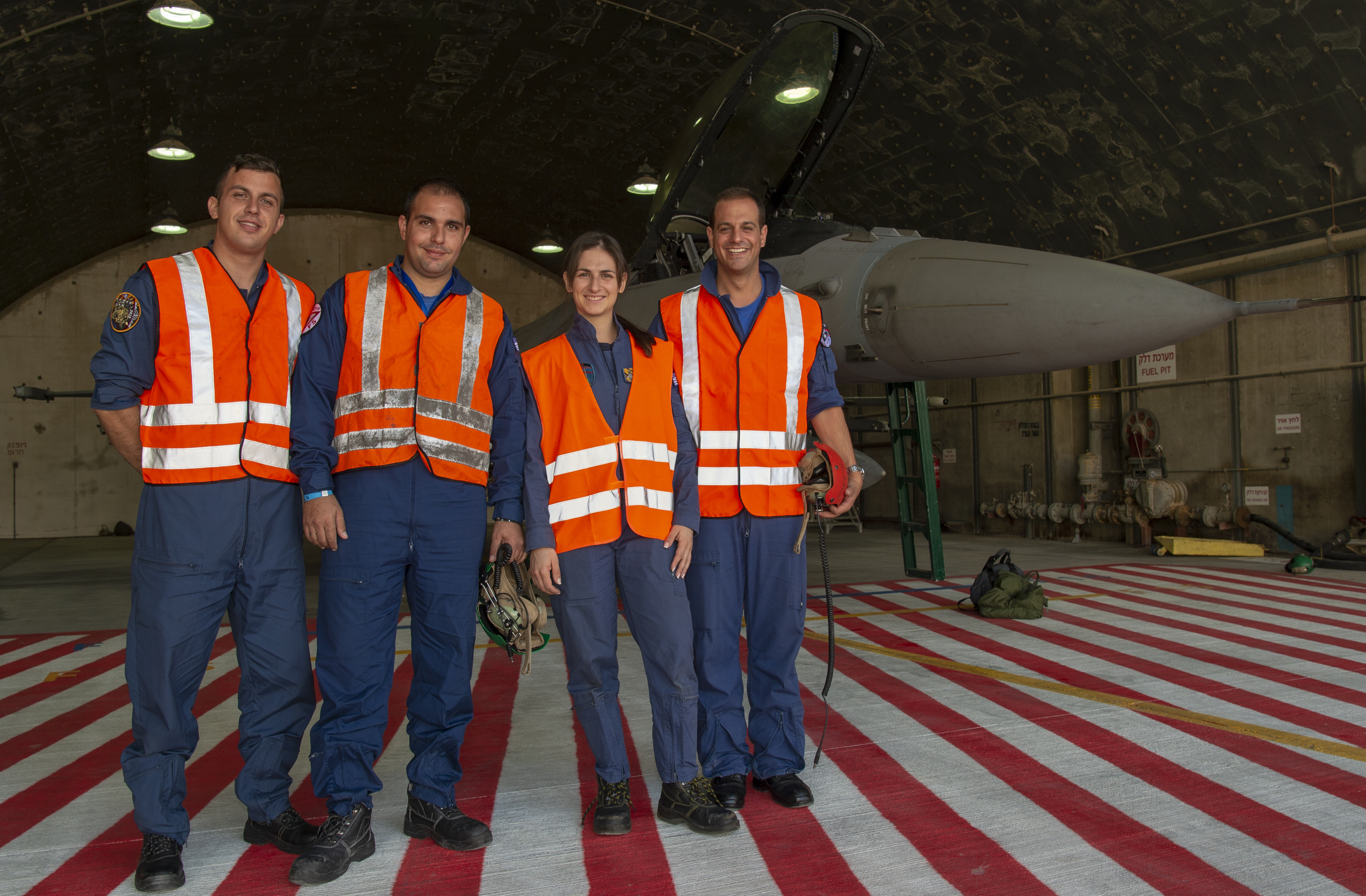 Hellenic service members from the 335th Fighter Squadron pose for a photograph during Blue Flag 2019 at Uvda Air Base, Israel, November 7, 2019. Blue Flag 2019 brought together members from the U.S., Israeli, Hellenic, Italian and German air forces. (U.S. Air Force photo by Airman 1st Class Kyle Cope)