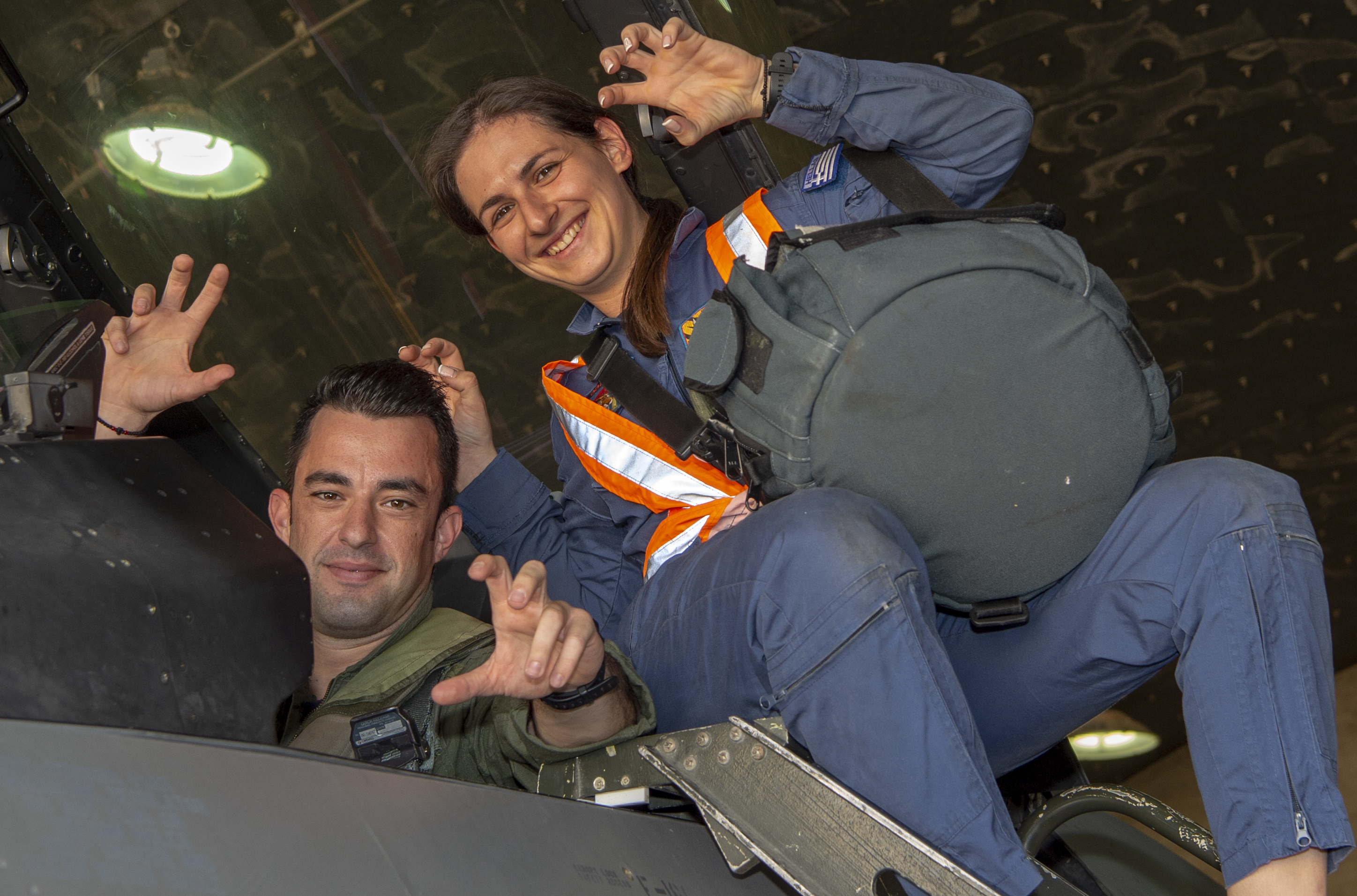 Hellenic air force 1st Lt. Andronikos Panou, 335 Fighter Squadron F-16 Fighting Falcon pilot, left, and Hellenic air force Master Sgt. Aggeliki Chrysanthoy, 335th FS F-16 Fighting Falcon crew chief, pose for a photograph during Blue Flag 2019 at Uvda Air Base, Israel, November 12, 2019. The two service members posed with their hands looking like claws because members of the 335th FS are known as the Tigers. (U.S. Air Force photo by Airman 1st Class Kyle Cope)