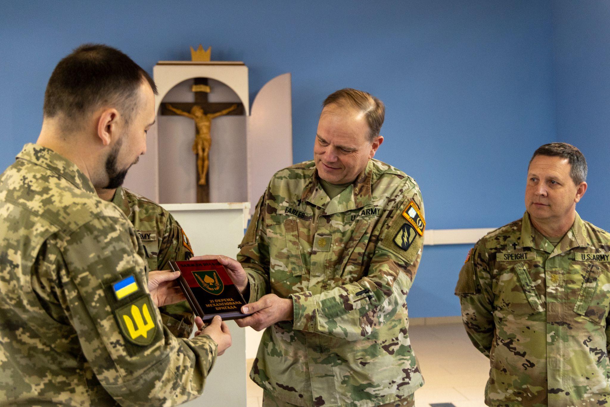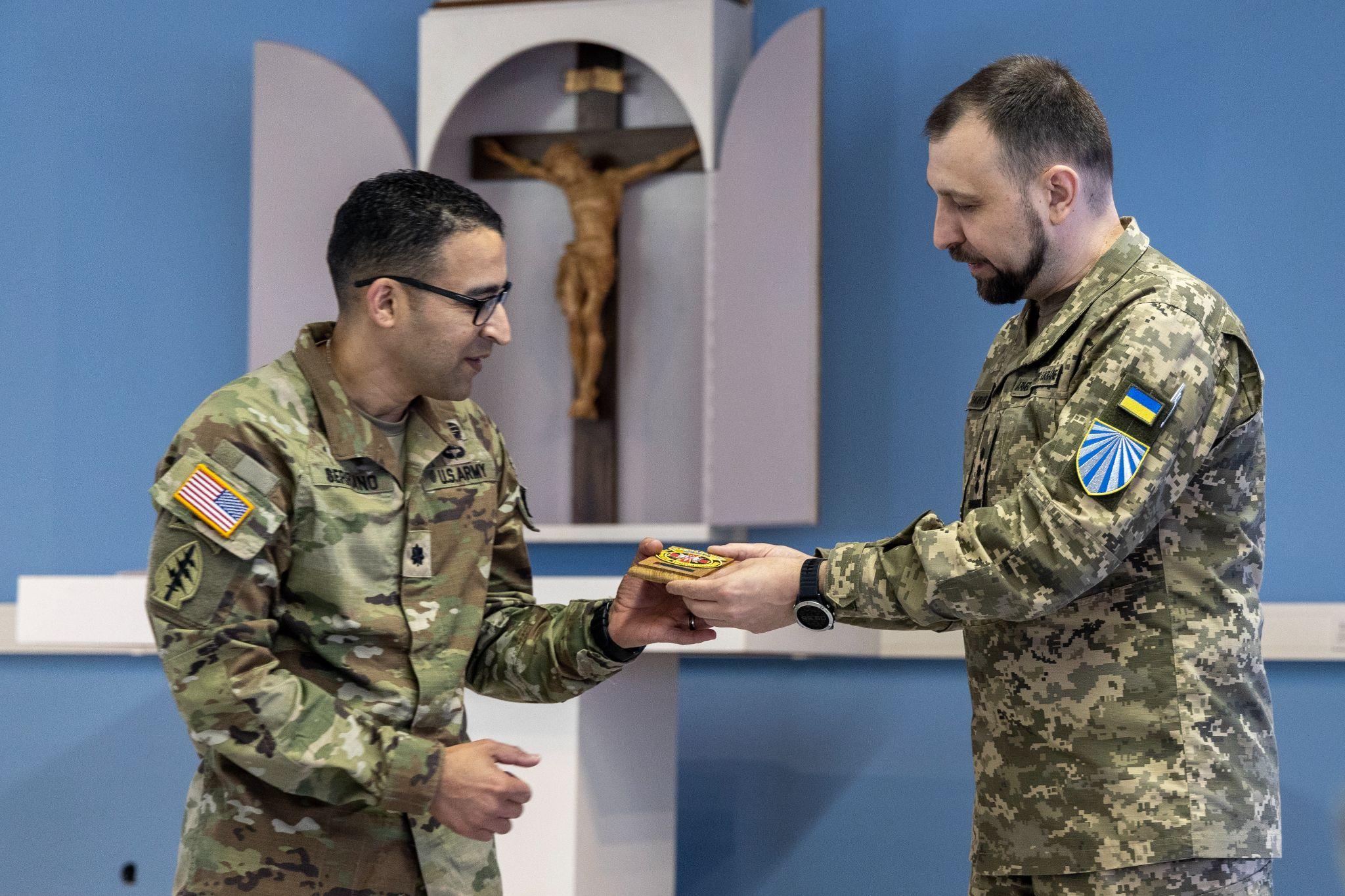 A U.S. Army Chaplain exchanges a gift with an Armed Forces of Ukraine Chaplain during the Chaplains Course graduation ceremony at Grafenwoehr, Germany, April 19, 2024. More than 20 Ukrainian Chaplains attended the fourth iteration of the Chaplains Course, April 8 – 19, 2024.