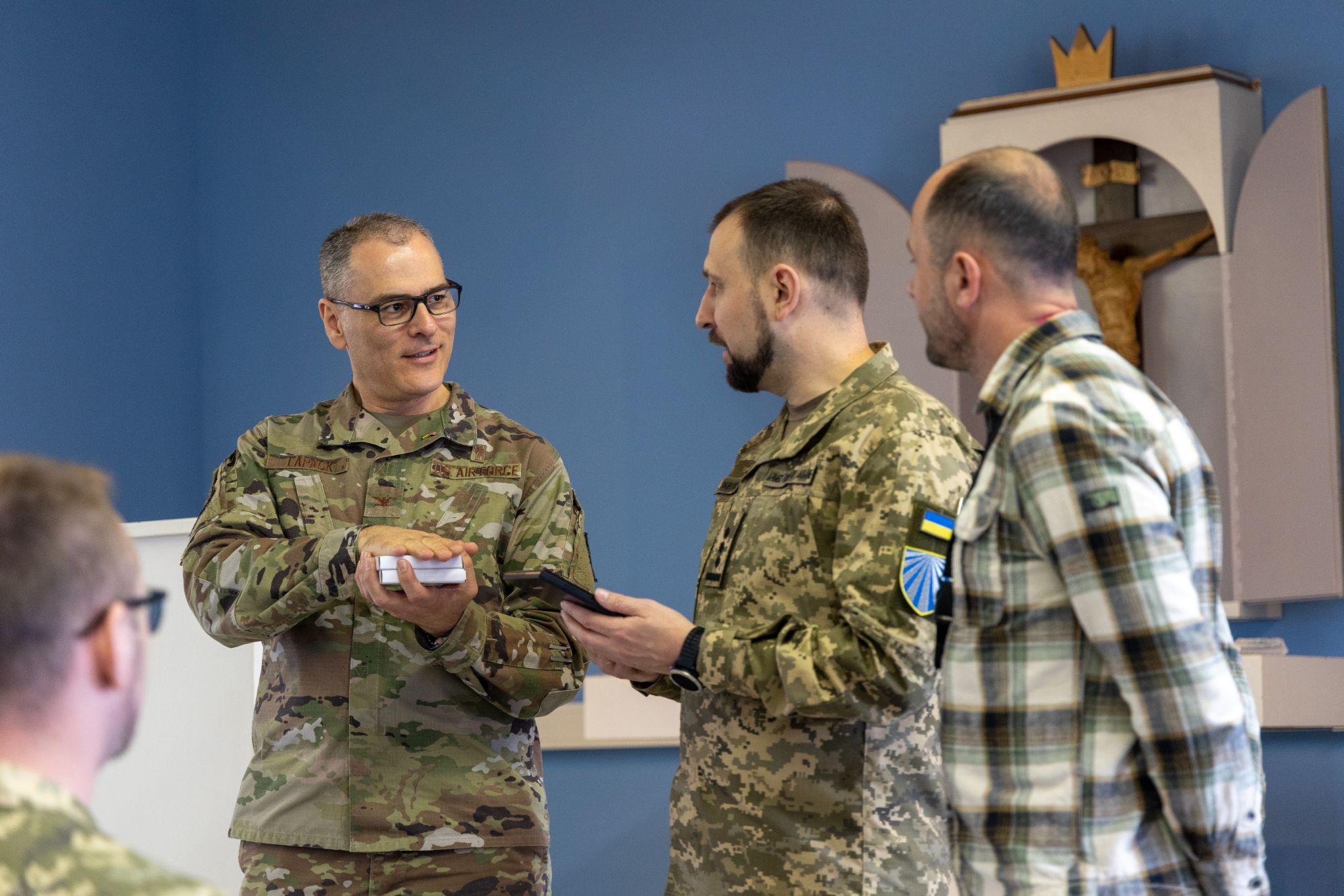U.S. Air Force Chaplain (Col.) Christopher Lapack, U.S. European Command, exchanges plaques with a Chaplain from the Armed Forces of Ukraine during the Chaplains Course graduation ceremony at Grafenwoehr, Germany, April 19, 2024. More than 20 Ukrainian Chaplains attended the fourth iteration of the Chaplains Course, April 8 – 19, 2024. (National Guard Photo by 2nd Lt. Jarvis Mace)