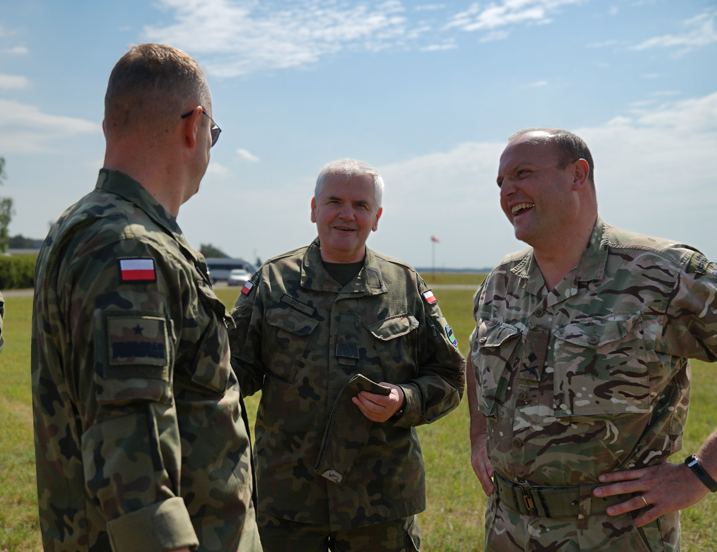 British Army Maj. Gen. Charles Hewit, vice director of operations at USEUCOM (right), and Polish Army Brig. Gen. Kazimiertz Dynski chief of the Air and Missile Defense directorate (center), observe a counter-drone simulation during a regional counter-drone workshop co-hosted by USEUCOM and the Polish Ministry of National Defense in Poznan, Poland, May 20-24, 2024.