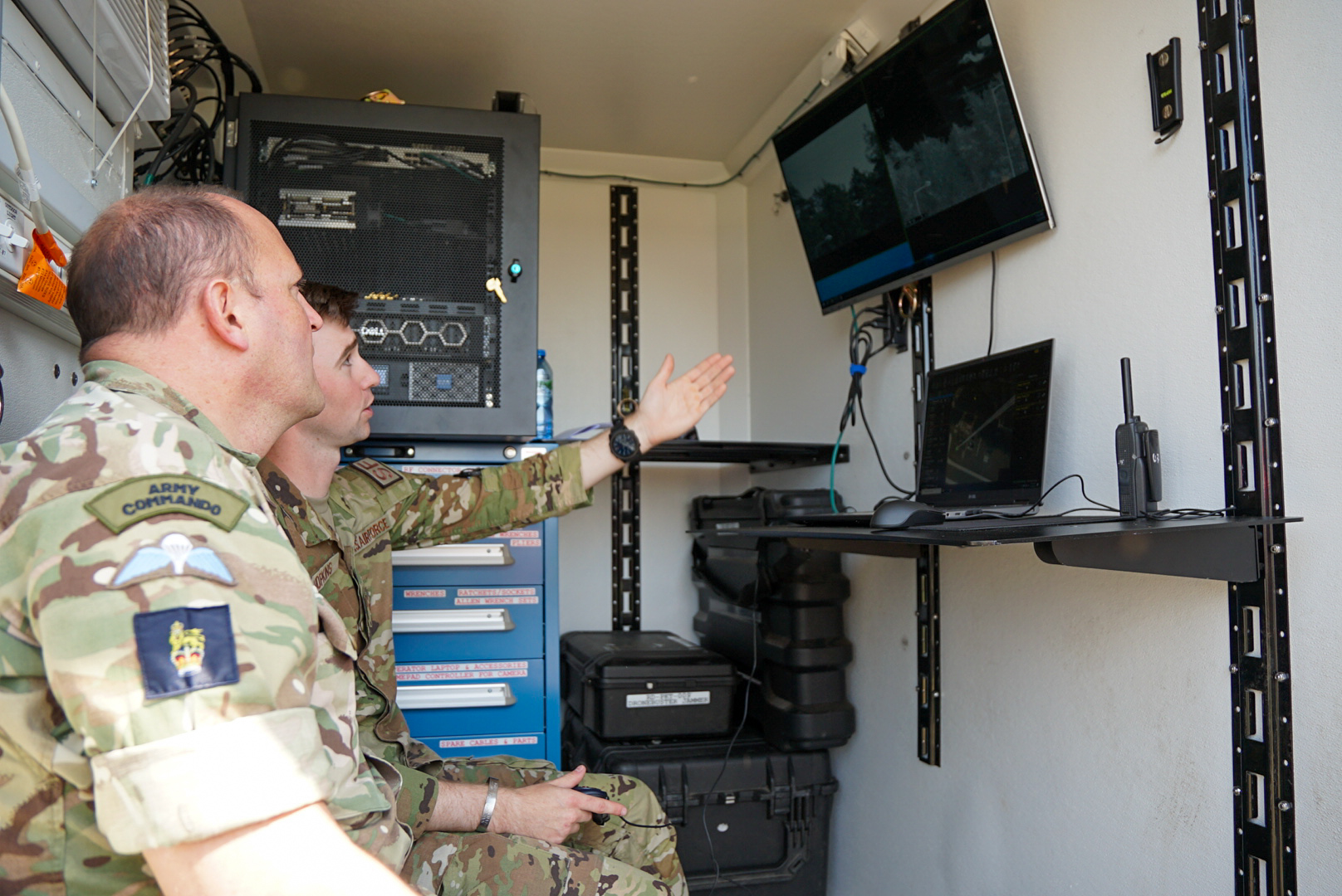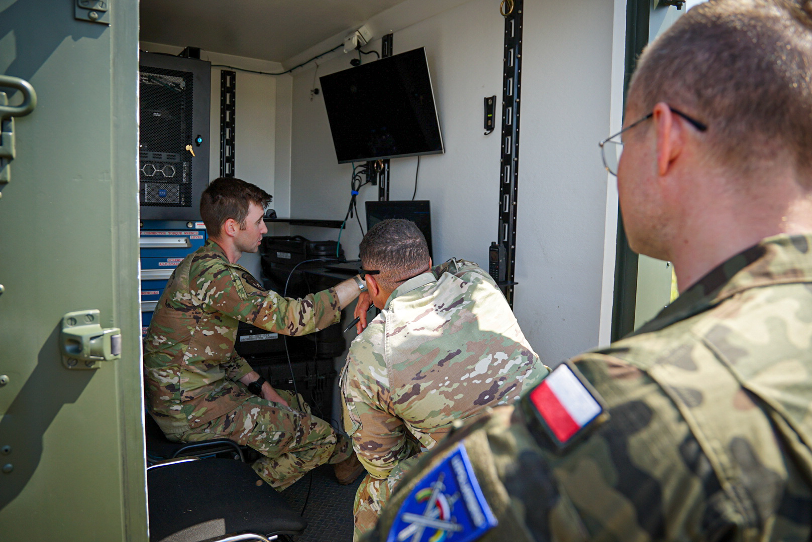 A Polish and U.S. soldier observe a counter-drone simulation during a regional counter-drone workshop co-hosted by USEUCOM and the Polish Ministry of National Defense in Poznan, Poland, May 20-24, 2024.