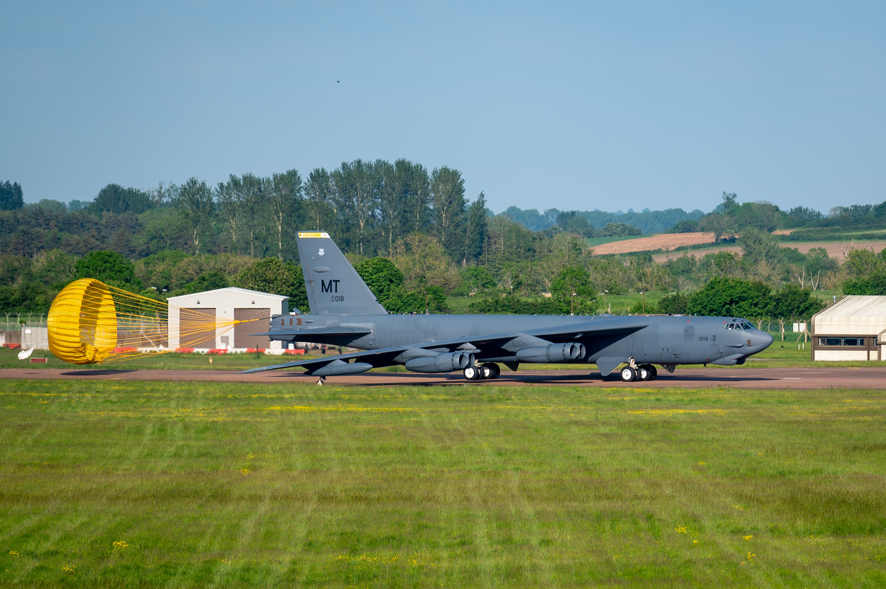 A U.S. Air Force B-52H Stratofortress, assigned to the 69th Expeditionary Bomb Squadron deploys a parachute at Royal Air Force Base Fairford, England May 29, 2024. U.S. participation in NATO-led training missions ensures preparedness and reinforces collective defense commitment. (U.S. Air Force photo by Airman 1st Class Jared Brewer)