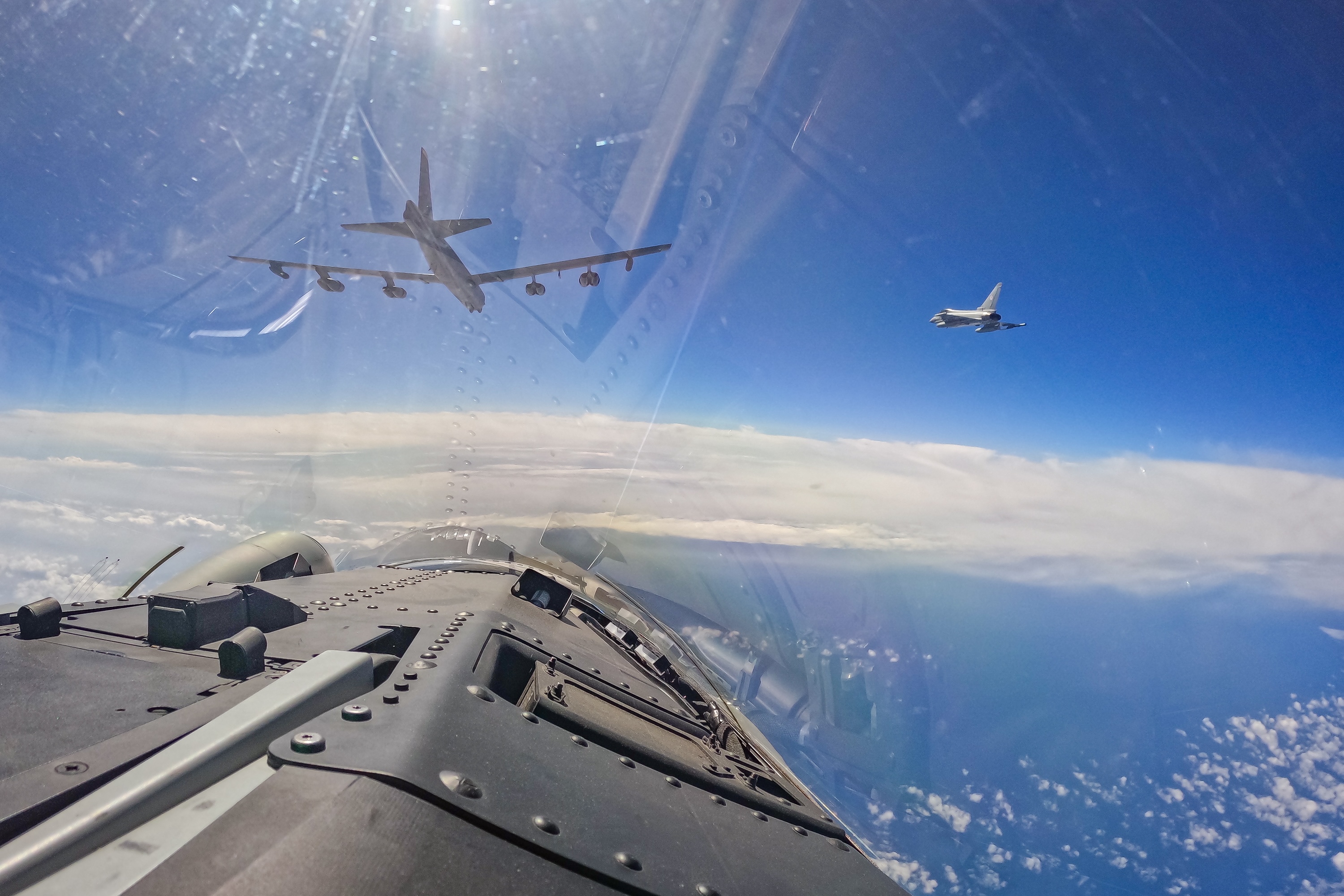 A Finish Air Force fighter jet flies alongside a U.S. Air Force B-52 Stratofortress as part of exercise Global Guardian's Bomber Task Force Europe 24-3 deployment, June 20, 2024.