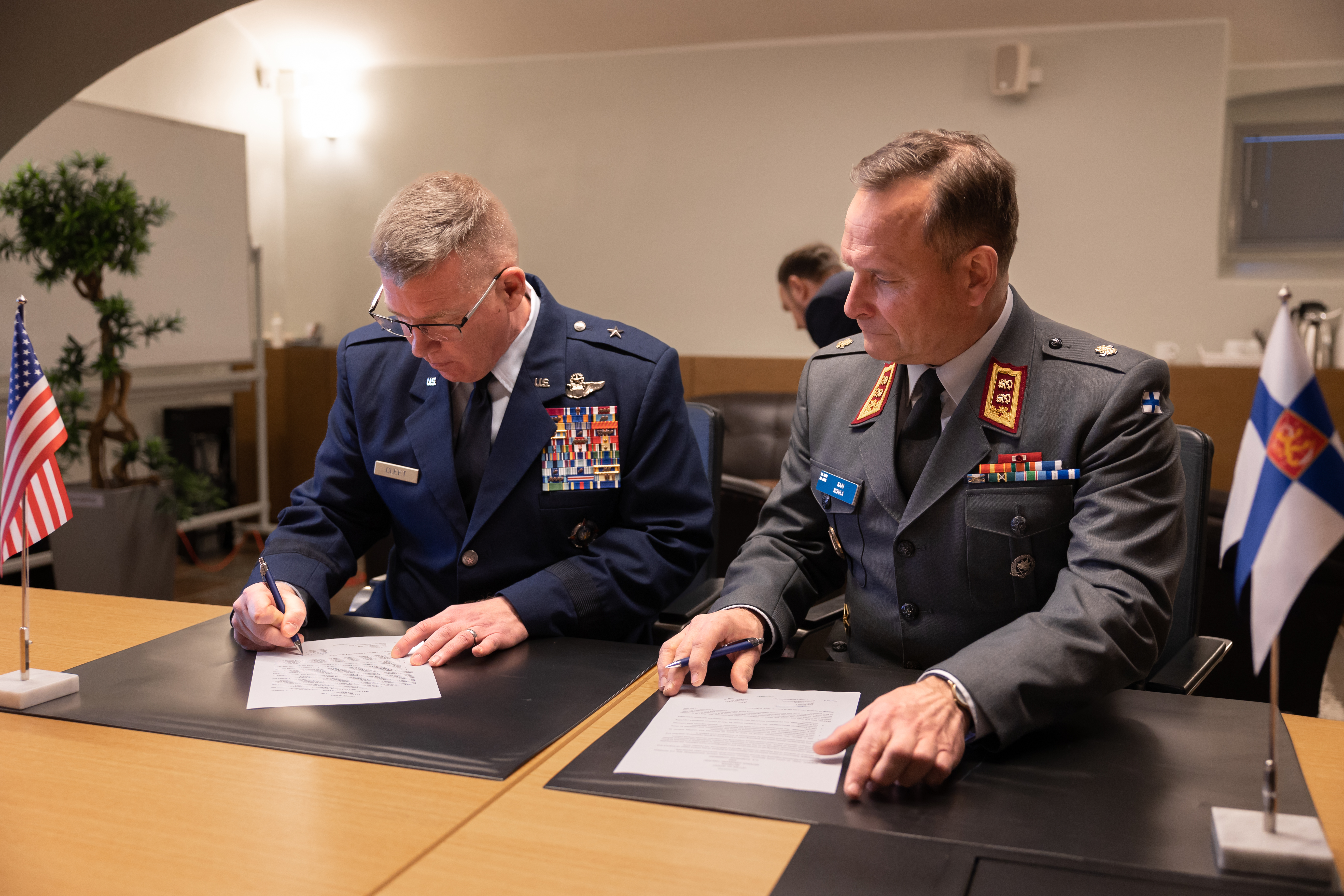 Finnish Defence Forces Deputy Chief of Staff Operations, Maj. Gen. Kari Nisula. U.S. European Command’s Deputy Director of Plans and Operations, U.S. Air Force Brig. Gen. James Cleet approved and signed a Letter of Intent for an advanced cyber partnership during a formal ceremony in Finland’s capital city, Helsinki, Jan. 24, 2024.