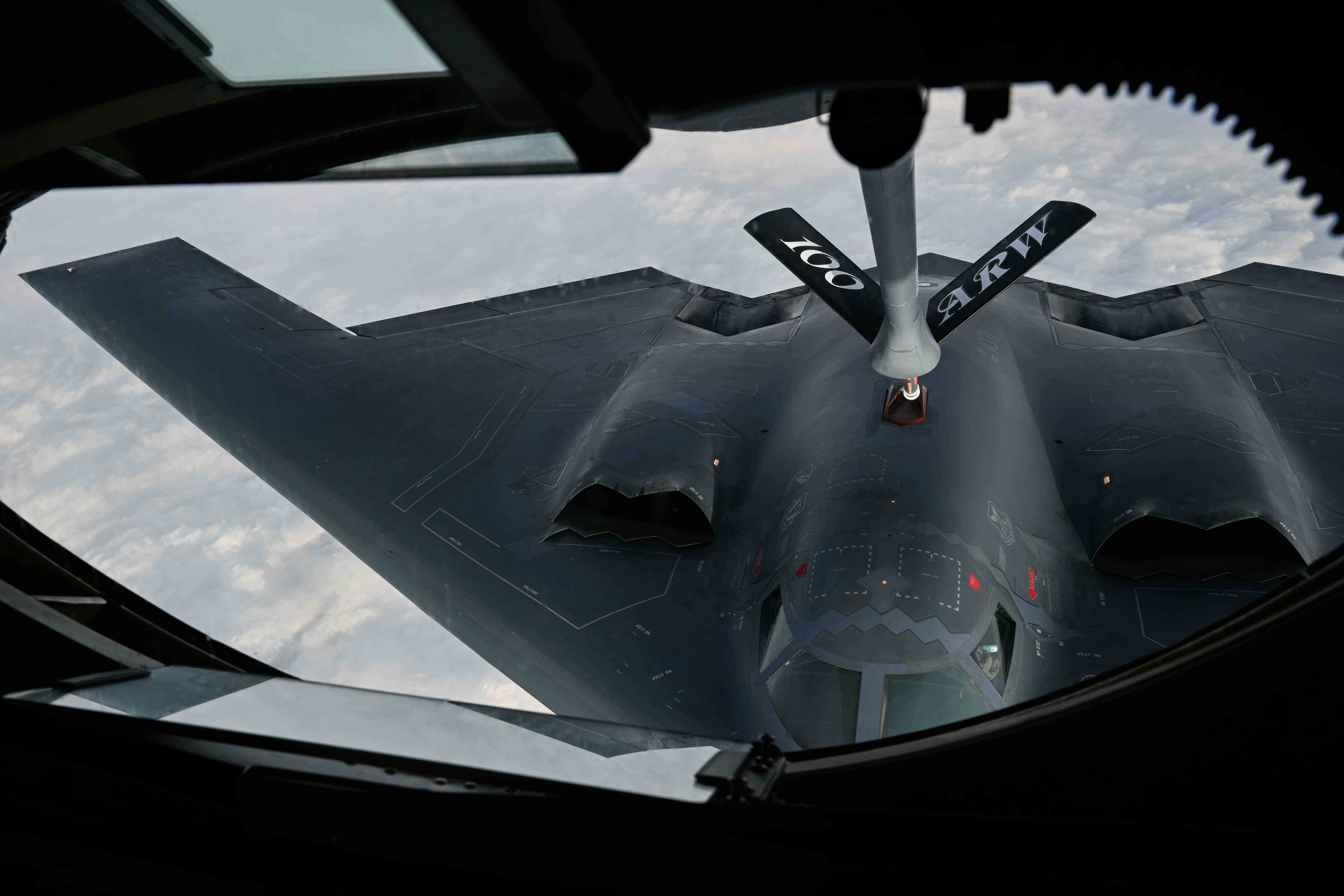 A U.S. Air Force B-2 Spirit from the 509th Bomb Wing at Whiteman Air Force Base, Mo., approaches a KC-135 Stratotanker from the 100th Air Refueling Wing, Royal Air Force Mildenhall, England, to receive fuel over the Atlantic Ocean, Feb. 7, 2024. Strategic bomber missions enhance the readiness and training necessary to respond to any potential crisis or challenge across the globe. (U.S. Air Force photo by Airman 1st Class Christopher Campbell)