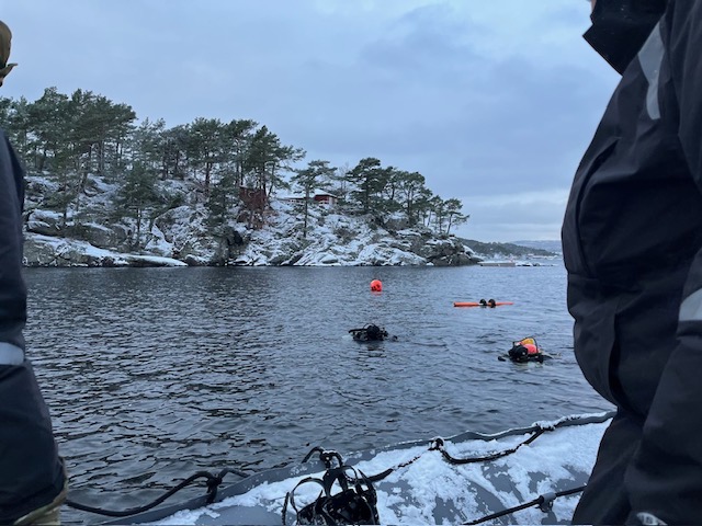 Sailors from Explosive Ordnance Disposal Mobile Unit (EODMU) Eight conduct a mine counter measure diving scenario with clearance divers from Norway and Denmark during exercise Arctic Specialist 24, Feb. 6, 2024. Exercise Arctic Specialist 2024 is an annual Norway-hosted multinational explosive ordnance disposal and mine countermeasures exercise focused on enhancing combined expeditionary command and control capabilities in the high-latitude and austere environments offered by Norway and its territorial waters. (U.S. Navy courtesy photo provided by Explosive Ordnance Disposal Mobile Unit Eight)