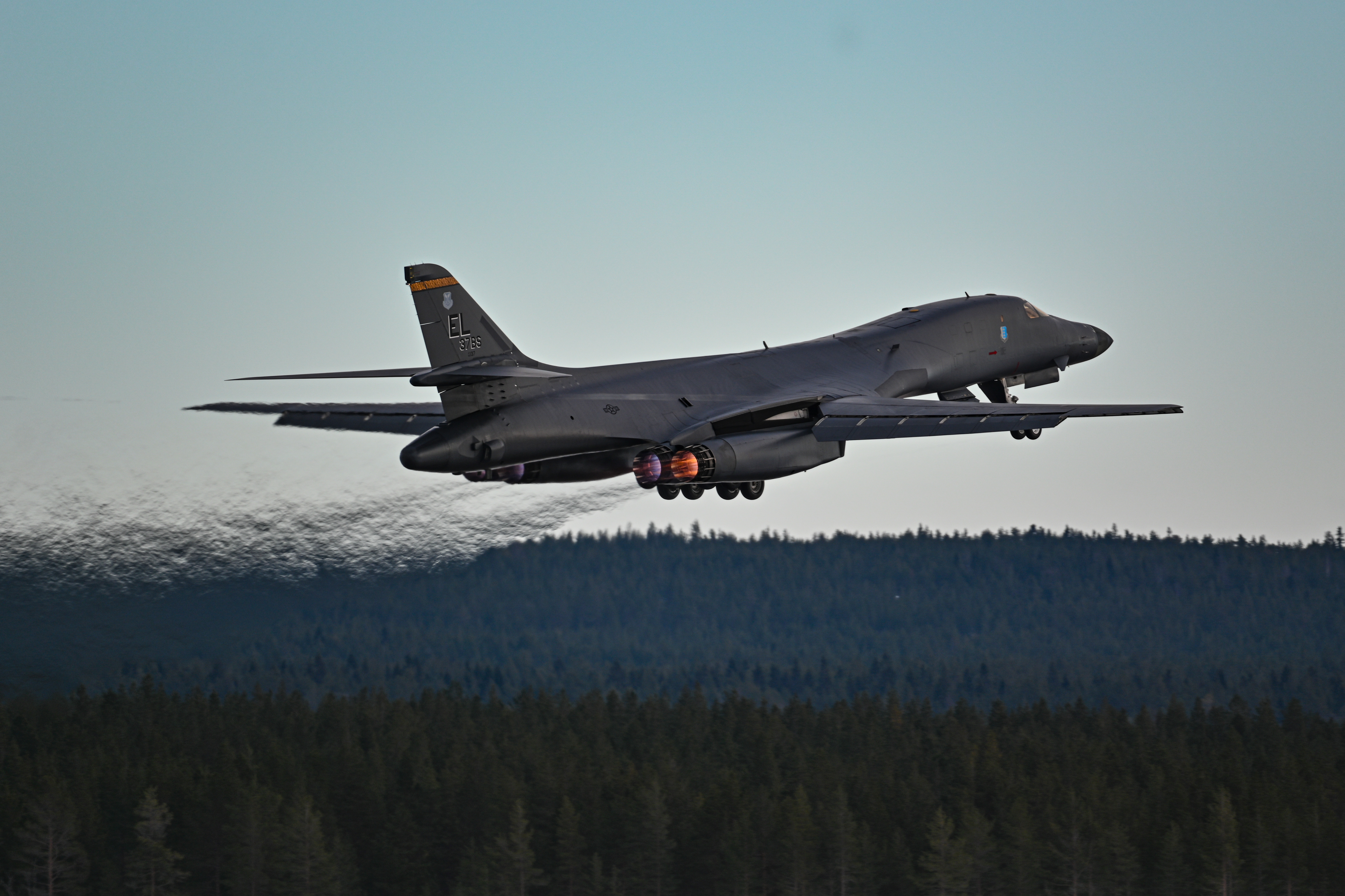 A U.S. Air Force B-1B Lancer assigned to the 28th Bomb Wing, Ellsworth Air Force Base, South Dakota, takes off at Luleå-Kallax Air Base, Sweden, Feb. 26, 2024, during Bomber Task Force 24-2. These BTF missions are representative of the U.S.' extended deterrent commitment to its Allies and partners and enhance regional security. BTF operations provide U.S. leaders with strategic options to assure Allies and partners, while deterring potential adversary aggression across the globe. (U.S. Air Force photo by Staff Sgt. Jake Jacobsen)