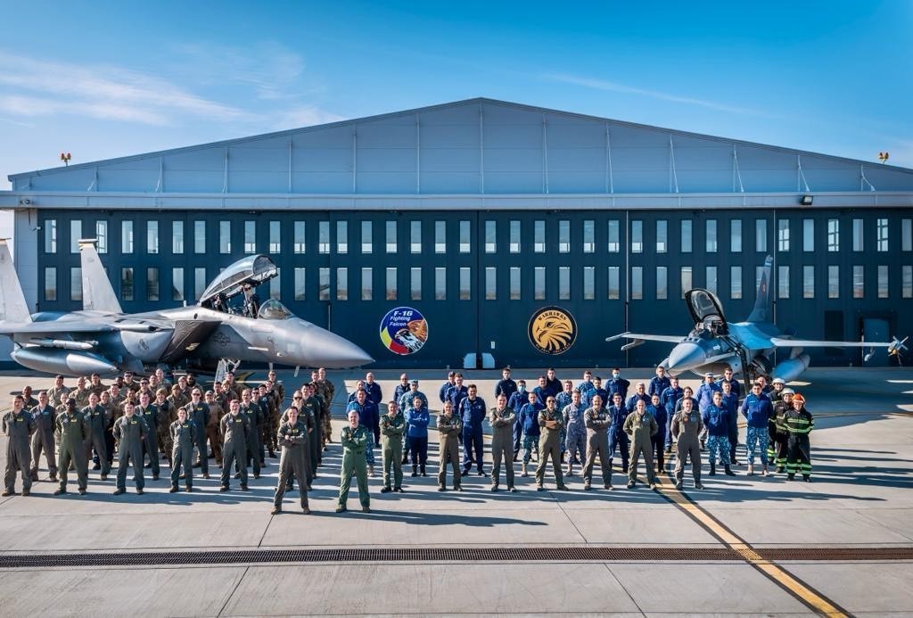 U.S. Airmen from the 336th Fighter Squadron, 4th Fighter Wing, Seymour Johnson Air Force Base, North Carolina, pose with allies from the Romanian Air Force's 53rd Fighter Squadron, 86th Air Base, Borcea, Romania, during operation Castle Forge, Nov. 4, 2021.
