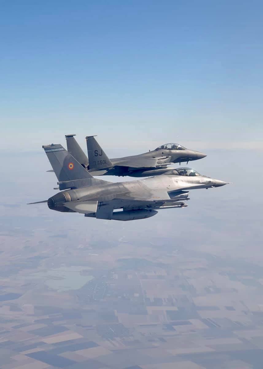 A Romanian F-16 Fighting Falcon from the 53rd Fighter Squadron, Borcea 86th Air Base, Romania, flies in formation with a U.S. F-15E Strike Eagle from the 336th Fighter Squadron, 4th Fighter Wing, Seymour Johnson Air Force Base, North Carolina, during operation Castle Forge, Oct. 20, 2021.
